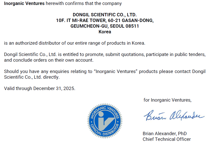 µ¿ÀϰúÇÐÀº Inorganic Ventures¿¡¼ ÀÎÁõÇÑ ´ëÇѹα¹ À¯ÀÏ °ø½Ä ÆÇ¸ÅÁ¡ÀÔ´Ï´Ù.