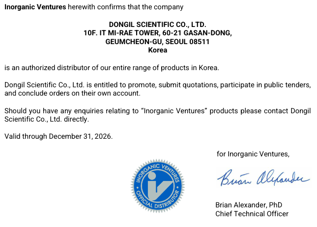 µ¿ÀϰúÇÐÀº Inorganic Ventures¿¡¼ ÀÎÁõÇÑ ´ëÇѹα¹ °ø½Ä ÆÇ¸ÅÁ¡ÀÔ´Ï´Ù.